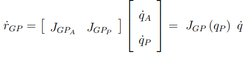 앞서 말한 것 처럼 로봇 팔의 조인트 속도는 모바일 플랫폼 속도에 영향을 주지 않는다. 또한 r_gp의 경우 직접적으로 모바일 플랫폼의 선속도와 각속도랑 관련이 있기 때문에 이에 대한 자코비안은 단위행렬이 된다. 따라서 식을 조금 더 풀어서 작성해보면
