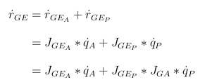 식이 뜻하는 것은, Arm 기준에서 표현 된 Global 기준, EE의 속도 벡터와 Platform기준에서 표현 된 GLobal 기준 EE의 속도 벡터를 더하는 것이다.각각을 더해서 최종적으로 Global기준 EE의 속도 벡터를 나타낸다.
