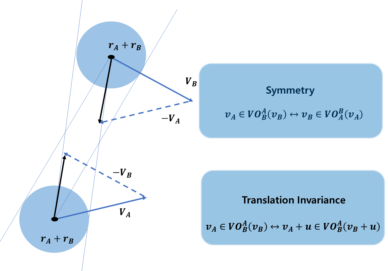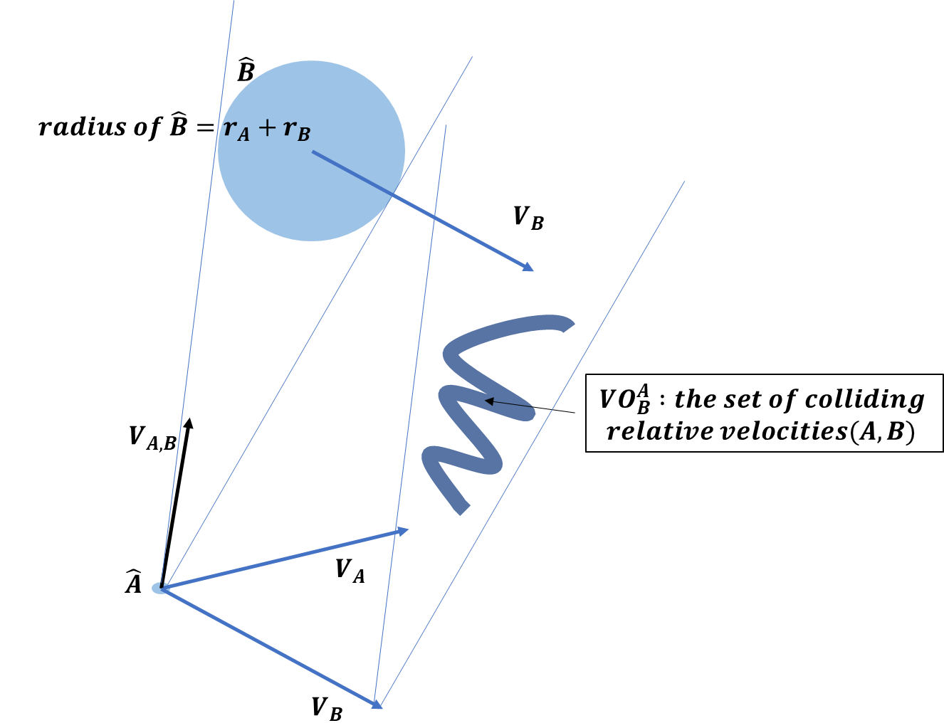 Local하게 장애물을 회피하기 위해서 Collision Cone 개념을 도입하는데 A의 상대속도 벡터가 Collision Cone 영역내에 존재 한다면 충돌한다고 얘기할 수 있고 Collision Cone 영역은 A와 B가 충돌하는 A의 상대속도 벡터의 집합이라고 볼 수 있다. 그리고 이러한 집합(영역)을 VO( Velocity Obstacle)이라고 한다.