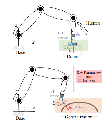 대부분의 Learning from demonstration의 방식은 force와 motion의 관점에서 사람의 행동에 집중하지만, 표면 마감에 중요한 파라미터들을 고려하지 않는다. 퀄리티에서 중요한 부분은 MRR을 조절하는 것이다. MRR 조절을 위해서는 표면적, 수직항력이 중요한 요소가 된다 + 툴 속도.