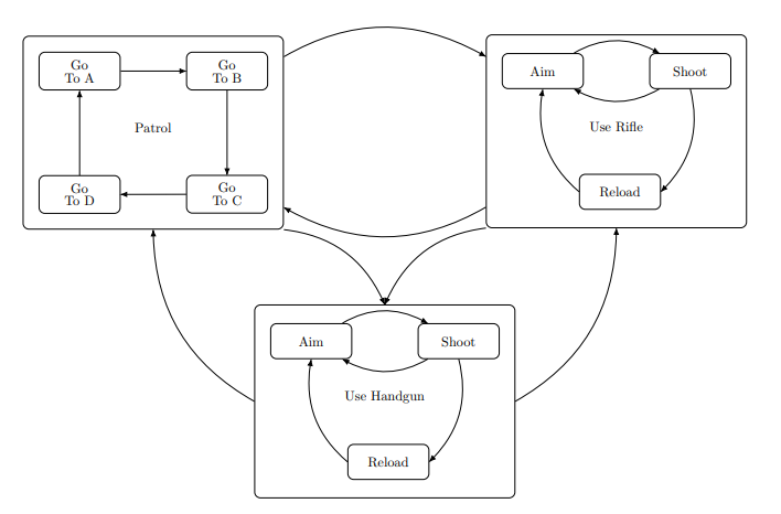 FSMs의 경우 one-way control transfer 형태로서, 시스템 혹은 에이전트가 반응하기 위해서는 state 간에 너무 많은 이동이 있어야하고, 이는 너무 많은 one-way control transfer이 많아진다는 것이다. 만약 하나의 state가 빠지게 되면 모든 state의 연결성이 변경되어야 한다는 치명적인 단점이 있다. 또한 당연하게도 하나의 state가 추가 되면 다양한 state에서도 추가 된 state로 이동하는 one-way control transfer를 모두 만들어줘야 한다. (엄청만 복잡도의 증가) 이런 문제점을 해결하기 위해 새롭게 나온 것이 HFSMs(Hierachical Finite State Machines)이다.
