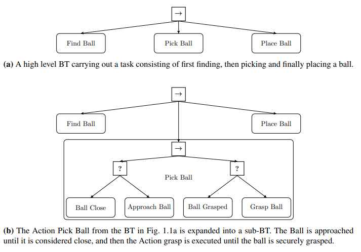 아마도 BT를 가장 잘 아는 사람들은 게임 업계 개발자분들 일것이다. BT는 자율적인 에이전트(agent)가 다른 일(Task)들을 바꾸는 방법을 구조화 하는 것을 말한다. 간단한 Pick and Place 구조를 위 그림에서 확인할 수 있다. BT의 가장 중요한 장점은 modular와 reactive이다.