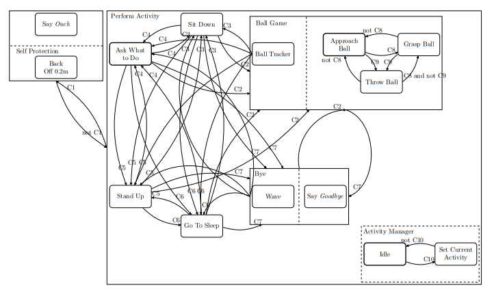 HFSMs(Hierachical Finite State Machines)은 State Charts라고도 불린다. FSMs의 단점을 보안하여 나온 방법론이다. HFSMs에서는 하나의 state가 하나 이상의 state를 포함할 수 있게 된다. 2개 이상을 포함하는 state를 suprestate라고 하는데, 일반적으로 state간의 전이는 superstate간의 전이가 된다. 즉 superstate간의 전이만 생각하면 된다는 뜻이다.