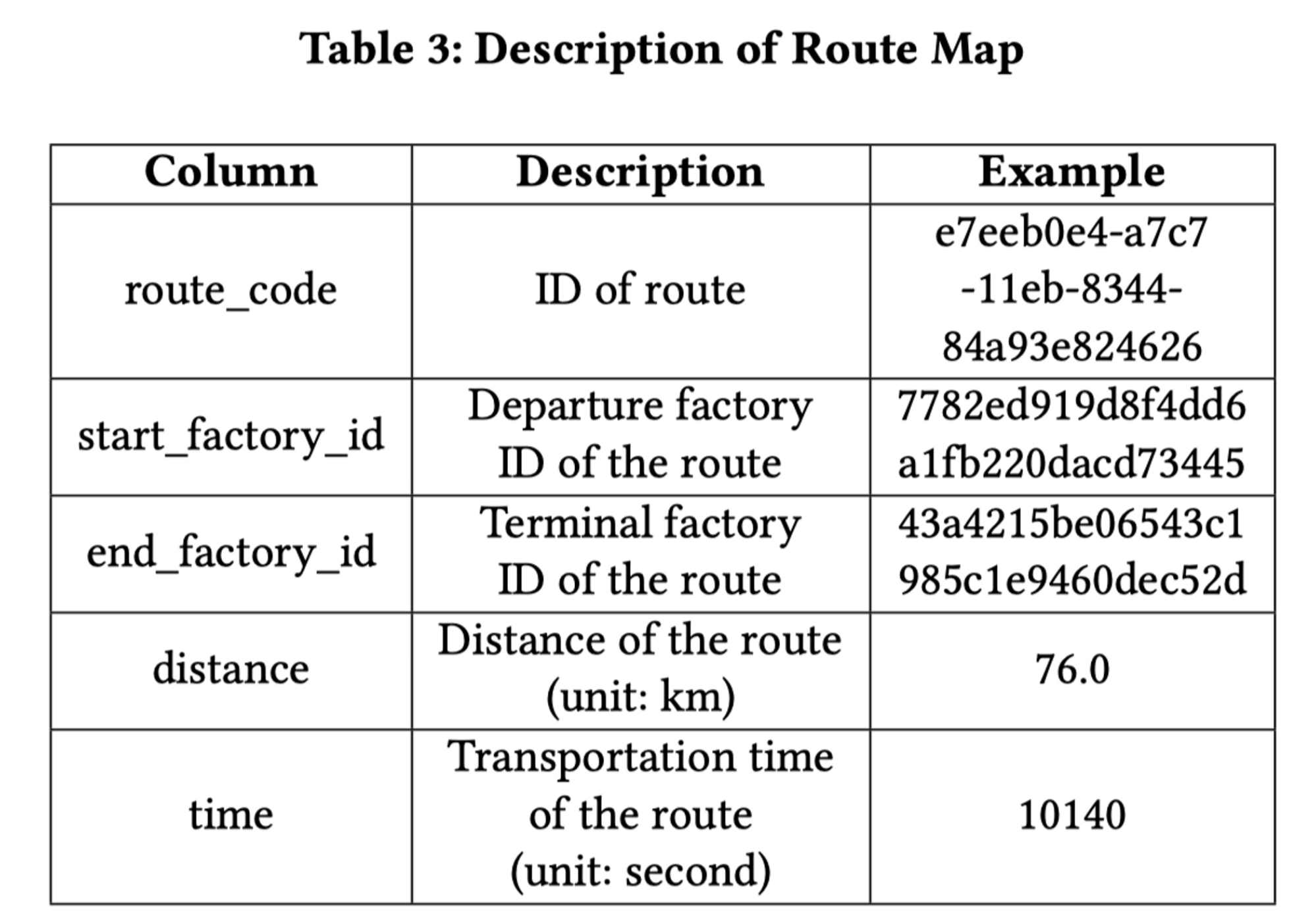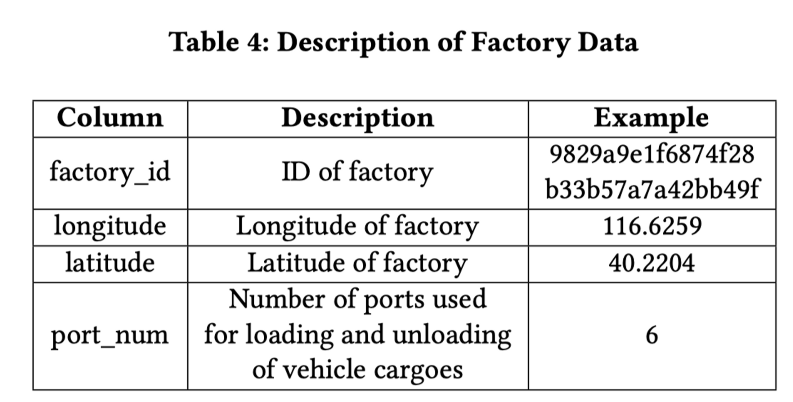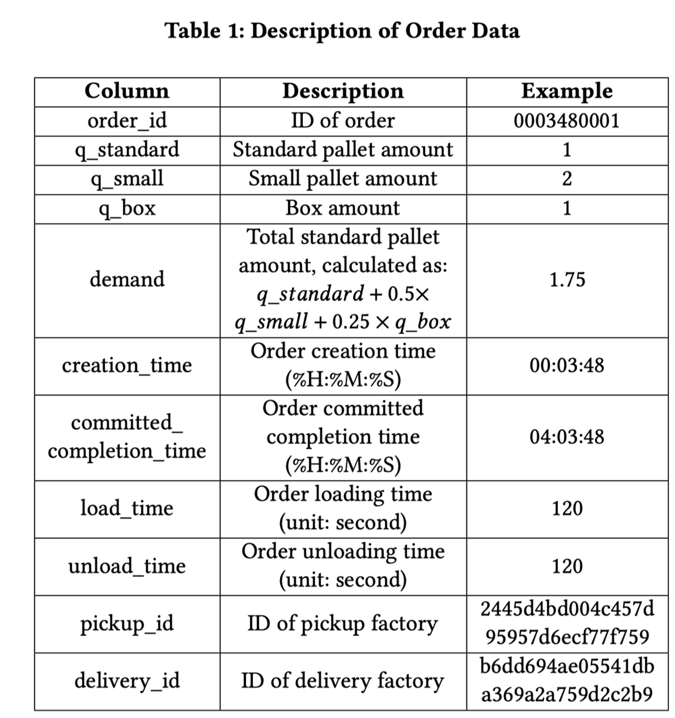 화웨이에서는 불확실한 고객 요구사항과 제조 프로세스때문에 사전에 딜리버리 요구사항을 완전히 결정하지 못했습니다. 실제 화웨이 공장에서는 Delivery Order가 무작위로 생성되고 이 오더를 처리하기 위해 차량들에게 주기적으로 스케쥴링되고 있습니다. 이때 Deliver order의 정보는 집품 공장, 배달할 공장, 화물의 수, 시간 요구사항이 담겨있습니다.