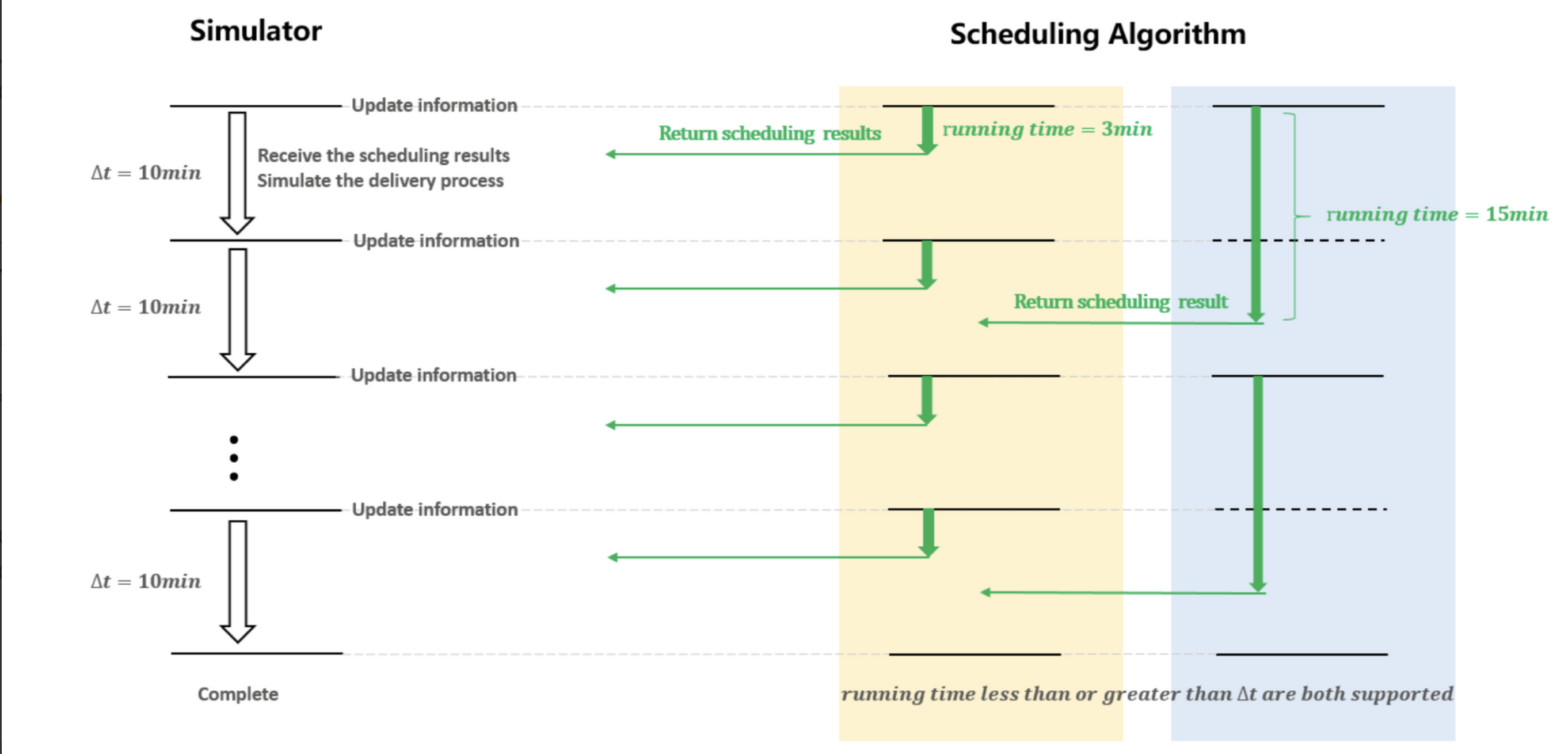 - 시뮬레이터가 차량 상태를 t1 시간에 알고리즘에 전달하고, t2시간에 알고리즘이 할당 결과를 시뮬레이터가 전달한다고 할 때 그 시간이 오래 걸렸다면, t2시간 때 차량의 상태가 엄청나게 달라질 수도 있다.