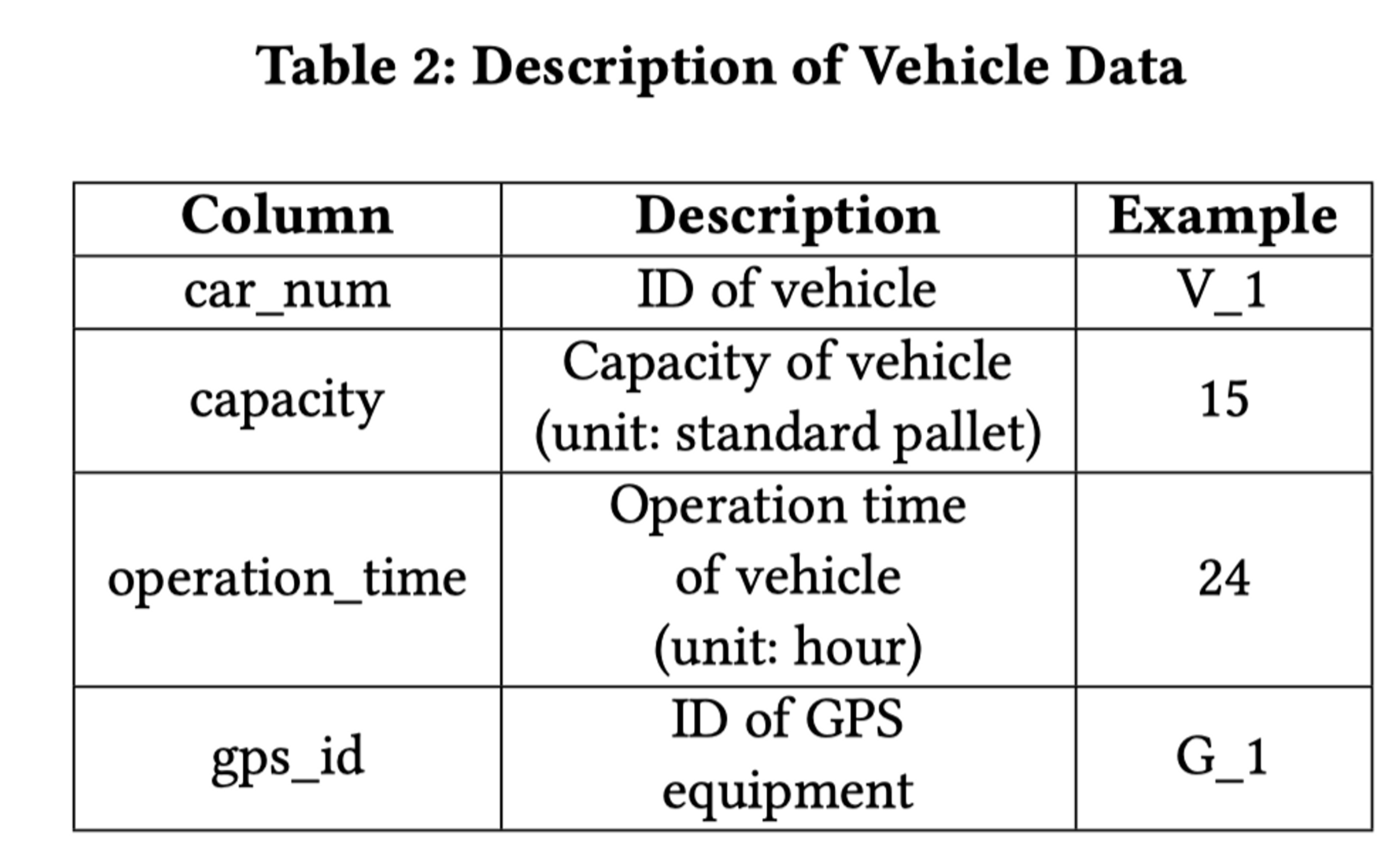 - 차량은 동일한 종류이다. 각 차량 $v_k$는 loading capacity와 운전수의 work shift(근무 시간)와 관련됨.