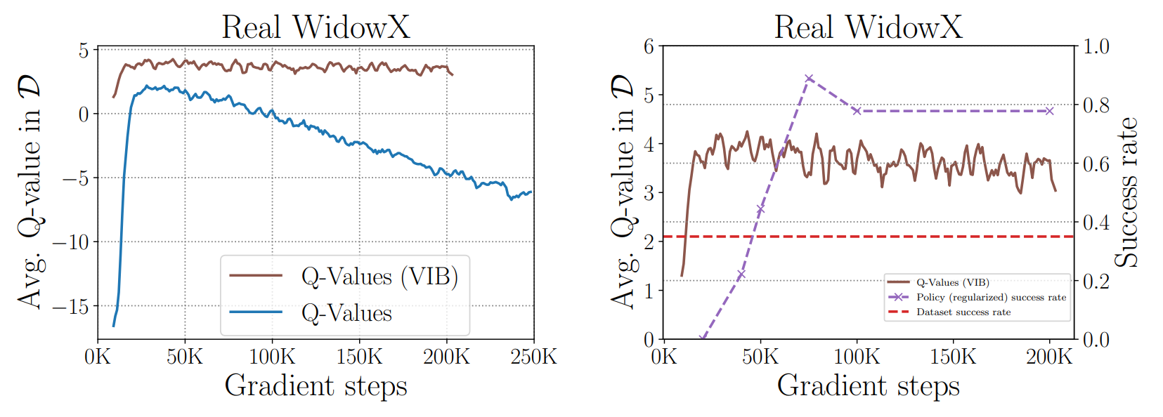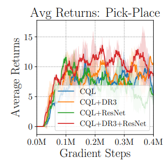 - 왼쪽 그래프를 보면 CQL의 Dataset Q-value 점차 감소하는 것을 볼 수 있으며, 이는 오버피팅 현상임.