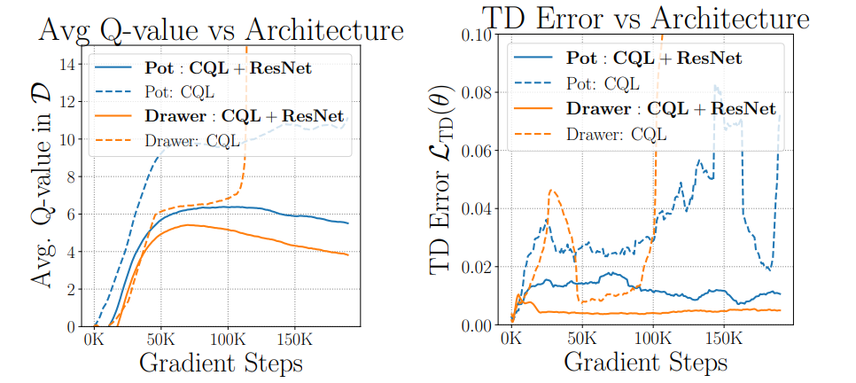 - 시도 2 : 현재 모델보다 모델 용량(레이어 수, 노드 수 등등..)이 큰 모델에서 TD error과 CQL regularizer를 측정