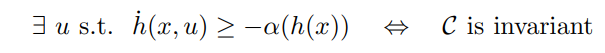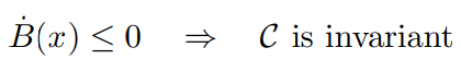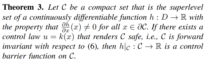 C를 연속 미분 가능 함수 h의 superlevel set이라고 하고, 이때 h는 경계 x에 대한 편미분이 0이 아닌 경우이다. 만약 제어 입력 u = k(x)가 C 영역을 안전하게 만든다면, C는 forward invariant하다. 그러면 h는 C에 대한 CBF가 된다.