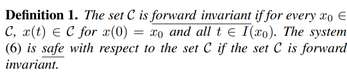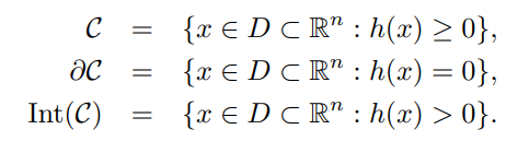 안정성은 시스템이 특정 포인트로 가게 만드는 거라면, 안전성은 safe set을 나가지 않게 하는 것이다. 여기서는 연속 미분 함수 h의 superlevel set으로 C 집합을 정의한다. 이에 따라 아래 형태를 safe set이라 정의한다.