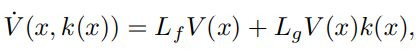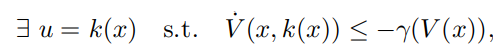 입력이 k(x)일 때 위의 조건이 성립하면, 이때 V(x,k(x))는 아래와 같고 감마는 양수이다. 리아프노프 이론의 변화율 조건을 생각하자.