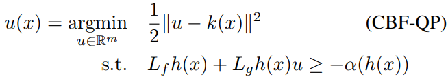 Kcbf에 대한 안전성 조건은 u에 대한 affine이라는 걸 알 수 있다. 따라서 u에 대한 최소한의 변화를 찾는 QP 기반 제어기를 고려할 수 있다.