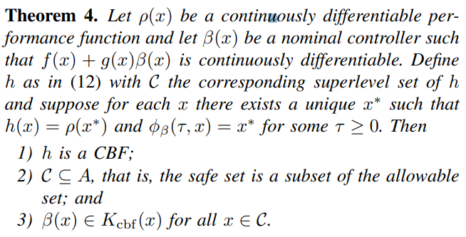 따라서 정리2번은 C가 연속 미분 가능 함수 h의 superlevel set으로 정의 된 안전한 영역인 경우, h가 D에서 CBF이며 경계C에서 h의 편미분이 0이 아닌 경우 Kcbf(x)에 포함되는 Lipschitz 연속 컨트롤러 u(x)는 시스템을 안정하게 만든다. 추가로 C는 시스템 공간 D내에서 점진적 안정적이다. Remark 5에 의하면 gradient h가 경계선에서 사라지지 않는 게 0이 h의 regular value인 경우와 동등하다고 한다. 이 조건은 안전성 정리에서 특별 조건은 만족시키는 데 필요 조건이다.