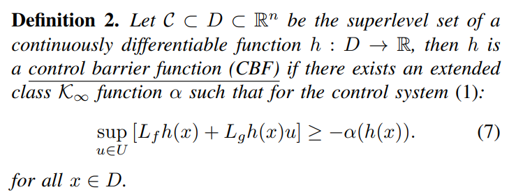 기본적으로 시스템 공간 D가 n차원의 부분집합이며, 특정 조건을 만족하는 안전영역 C가 D의 부분집합이 된다. 이때 h는 D에서 정의 된 실수 공간으로서의 연속 가능한 미분 함수인데, h가 안전 영역 C의 superlevel set인 경우 h를 CBF라고 한다. 단, CBF라고 하기 위해서는 extended class kinf 함수 알파가 위에서 이야기했던 x=f+gu 형태의 제어 시스템에서 존재해야 한다. (f와 g는 로컬 Lipschitz 함수라는 걸 기억하자).