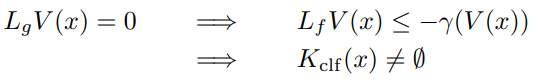 위 Kclf 집합은 제어 입력 u로 정의 된다. 이 집합은 affine contrain이 걸려있다. 따라서 최적화 기반 제어기를 설계할 수 있게 해주는데, 이는 V가 CLF인 조건을 설명하기도 한다. 예를 들어