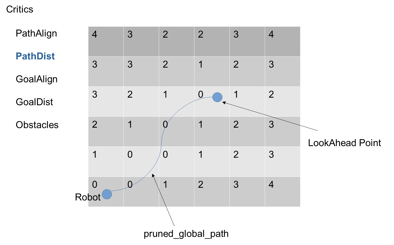 전역 목적 지점에 가깝지 않은 경우 (생성된 경로의 속도)*slowing_factor_ + scoreRotation(생성된경로에 대한 평가)로 평가되며 이는 모바일 로봇이 회전하는 동안 주행 속도가 늦춰지도록 장려합니다.