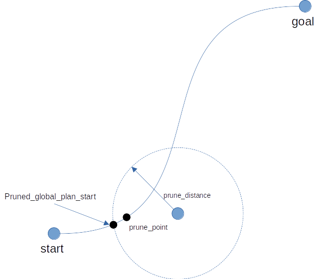 전역 경로의 시작점부터 prune_distance 만큼 떨어진 범위 이내에서 로봇과 경로점의 거리가 prune_distance보다 작은 첫번째 전역 경로 점을 조정된 전역 경로의 시작점으로 재정의 한다. 이는 로봇이 지나는 경로를 어느 범위까지 고려할 것인지에 대한 요소이며 로봇이 생성한 경로가 이미 지나온 경로에 대해 평가를 하지않음을 의미합니다.
