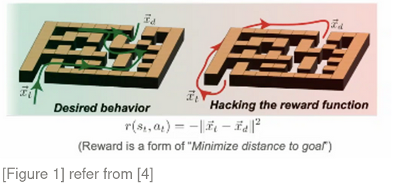 - [Figure 1]과 같이 agent가 maze map에서 목표 지점을 가는 경우, reward hacking (bugs)가 발생하게 되면, reward 설계자가 의도하지 않은 행동을 통해 return을 최대화하는 현상[Figure 1] refer from [4]