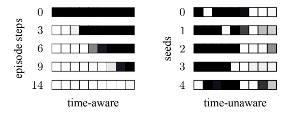 - Time-aware agent는 time step별로 다른 policy를 학습