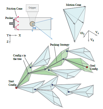 2018 ICRA 논문에 의해서 RSS에 나온 논문에서는 Friction cone -> Wrench cone에서 한단계 발전한 Motion Cone의 개념을 설명한다. 이전 논문에서 말한 pusher가 물체에 stick 하는 경우에 가질 수 있는 motion을 cone 형태로 나타냈다. 이를 통해 미는 동작의 복잡한 동역학을 공간 안 제약시켜 표현할 수 있게 된다. Motion cone을 샘플 기반 경로 계획에서 사용하여 빠른 미는 동작 경로를 계획할 수 있게 된다.
