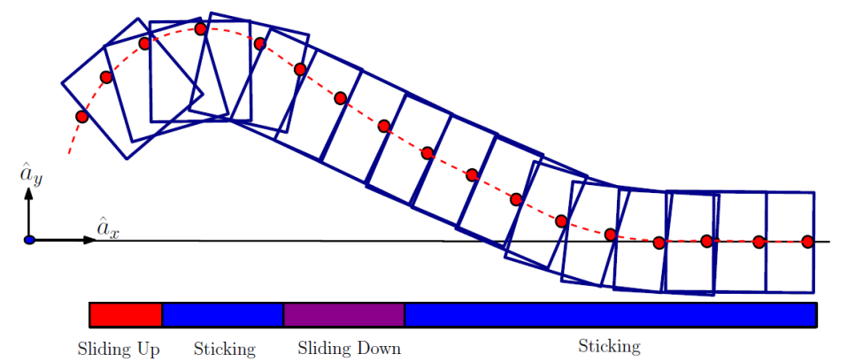 2018년도 ICRA 논문에서는 동역학적으로 효율적인 방식을 통해 2017년도 ISRR에서 사용했던 Complementarity formulation보다 100~1000배 빠르게 계획할 수 있게 된다. 일반화 된 마찰 원뿔을 통해, pusher의 힘이 마찰 원뿔 안에 있는 경우, 즉 붙어 있는 경우(stick)를 안정하다고 생각하고 계획하여 이전 논문에서 사용 된 complementary 제약 조건을 없애고 제약 조건을 만족하면 되는 문제로 변형하는 것이 stable pushing이며 이것이 더욱 효율적인 방식이었다.