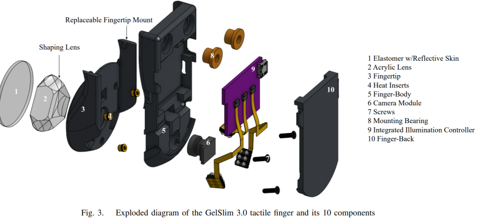해당 논문에서는 텍타일 센서 기반 손가락을 오픈소스로 개발한 내용읃 다루고 있다. 이전 Gelsight과 다르게 GelSlim은 Compactness, Analytic Measurement Methods, Design for Assembly 방식으로 만들어졌다고 한다. https://github.com/mcubelab/gelslim