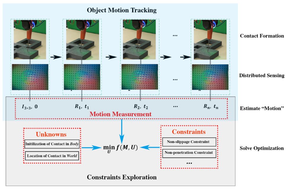 해당 논문에서는 환경과 집고 있는 물체의 접촉을 로컬라이제이션 하는 방법에 대해 설명한다. 외부 접촉 센서 측정 문제를 제약 기반 예측 문제로 정의한다. 강체 운동에 의거한 기구학와 마찰에 따른 기구학적 제약 조건으로 예측을 진행한다. 기존 F/T 센서를 통해 예측 됐던 방법은 물체의 기하학적 정보를 모를 경우 적용하기 힘들다. 따라 텍타일 센서를 이용해 물체의 모션을 측정하고 이를 통해 접촉 위치를 로컬라이제이션 할 수 있다. 특정 기구학적 제약 조건들(접촉 위치는 회전과 이동과 별개로 유지된다)을 모션과 파라미터로 이뤄진 함수를 최적화 하는 방향으로 사용하면 우리가 원하는 접촉 위치를 찾을 수 있게 된다. 텍타일 센서 데이터의 경우 3차원의 위치 정보를 얻을 수 있기에 0~k번 frame까지의 데이터를 이용해 Least square fitting 문제를 풀어 상대적인 움직임을 예측할 수 있다. 논문에서의 언급하는 한계는 제약 조건을 만족하기 위한 특정 접촉 상태를 가정해야 한다는 것이다. 좀 더 정확한 예측을 위해 물체의 움직임에 대한 모든 제약 조건들을 확인하는 게 필요하다 얘기한다. 결국 exploration과 다른 접촉 유형에도 유연하게 작동해야한다는 것.