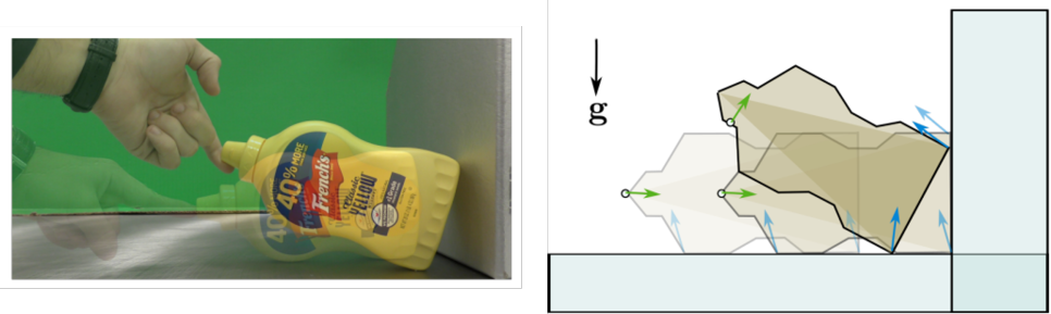 2015년도 IROS 논문에 이어, In-hand manipulation에 대한 접촉 동역학의 실험 검증 논문이다. 그리퍼, 집은 물체 그리고 환경과의 접촉 상황에서 모션과 힘을 예측하는 접촉 모델의 평가를 보인다. 논문에서는 접촉 동역학 모델이 실제로 경향성은 비슷하게 예측할 수 있지만 정확한 예측은 어렵다고 설명한다. 특정 상황에서는 힘이 2N까지도 차이를 보였다. 또한 모션과 힘 사이에 단순한 결정론적 매핑이 없다는 것을 이야기 한다. 즉, 물체를 움직이게 하거나 멈추게 하는 과정에서 모션에 따른 힘을 예측하는 것이 쉽지 않다는 뜻.