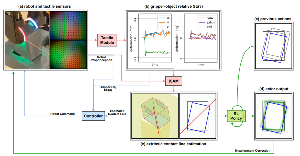 해당 논문은 active하게 집은 물체와 환경 간의 접촉을 예측하여 구멍에 삽입하는 정책으로 사용하는 연구를 보인다. 예측 모델과 텍타일 피드백 제어기가 같이 사용되어 외부 접촉을 정확히 예측한다. 텍타일 신호로부터 직접적으로 학습한 이전 연구와는 다르게 이번에는 시뮬레이션에서도 바로 학습될 수 있다. 이전 방식보다 높아진 성공률을 보인다. extrinsic 접촉 로컬라이제이션 문제는 로봇의 proprioception과 텍타일 센서 데이터를 합치기 위해 factor graph와 iSAM을 이용했다. 삽입 정책에는 텍타일 이미지 대신 contact line estimation이 사용됐다. 이로 인해 실제 데이터를 모을 필요가 없어졌다. Estimation에 대한 이전 연구들은 모두 passive하였기에 이전 연구들이 보여준 정보에서만 사용될 수 밖에 없었다. Insertion에서의 경우 여러 방법들이 있었지만 sub optimal하거나 실제 환경에서 데이터가 모여져야만 했다.