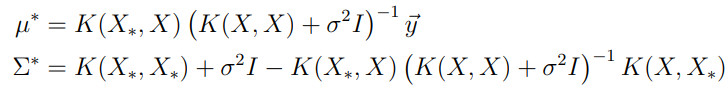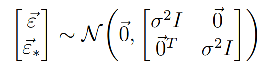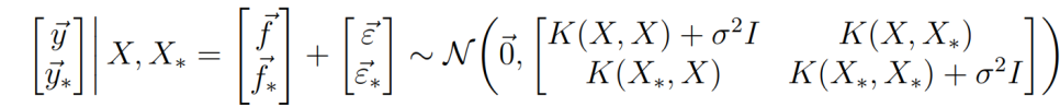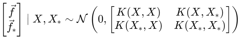 GP는 기본적으로 Training에서의 X값과 testing에서의 X_* 입력에 대해 함수 f가 다변량 정규 분포를 따른다고 가정한다. 이 때 zero-mean GP라 하면 가우시안 분포는 아래와 같이 표현된다. 노이즈 또한 비슷한 모양으로 표현될 수 있다.