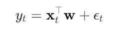 위와 같은 선형 모델을 만들어보자. y_t는 출력, x_t는 입력값이다, W는 파라미터, 엡실론은 노이즈를 나타낸다. LR은 주로 간단한 파라미터를 Estimation 할 때 사용 된다. 로봇으로 예를 들자면 y는 로봇의 상태(로봇의 위치, 속도 등)가 되고 x는 모터 입력(제어 입력)이 된다. 이때 제어 입력과 로봇의 상태의 상관관계를 표현하는 파라미터를 w에 넣게 된다. 즉, 일련의 측정값을 벡터로 모아서 식으로 표현한 형태이다.