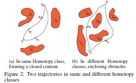 주로 장애물 기준으로 시계 방향이냐, 반시계 방향이냐에 따라 서로 다른 호모토피 클래스가 나뉜다. 이런 다른 호모토피 클래스 중에 최적 경로를 찾는 게 목표이다.