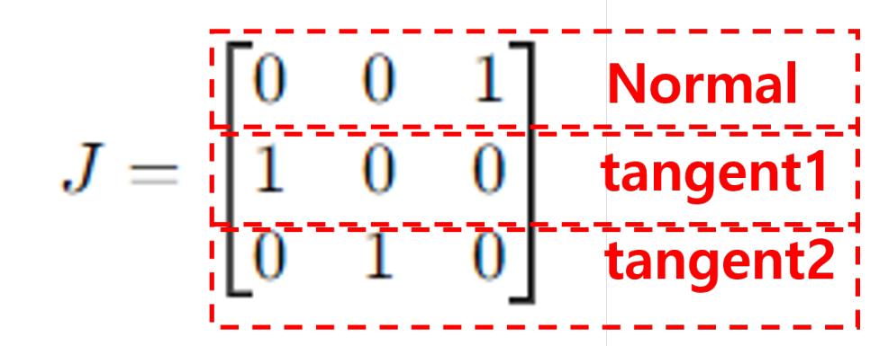매우 간단하다. 각 행별로 수직 방향, tanget 방향, tanget 방향을 뜻한다. 순서를 꼭 기억하자. normal 방향이 먼저오기 때문에 자코비안과 곱해지는 무엇이든 가장 먼저 수직 방향의 성분들이 나오게 된다. 자코비안 * 물체의 속도를 하게 되면 수직방향 속도, x방향, y방향의 속도가 나온다고 생각하면 편하다.