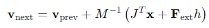이 3개의 LCP를 1개의 행렬로 묶어서 하나의 LCP 형태로 표현해보자. 시작은 이진화 된 뉴턴 오일러 방정식으로부터 한다. 접촉에 대한 속도-임펄스 식을 표현하면 아래와 같다.