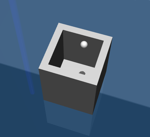decompose된 collision mesh를 확인해보면 위 사진처럼 보인다. 기존에 상자 위(공중)에 떠 있던 구슬이 상자 안쪽으로 잘 들어가 있는 모습도 볼 수 있다. 물론 decompose한 geom mesh에 solref와 solimp등을 설정해줘야 한다.