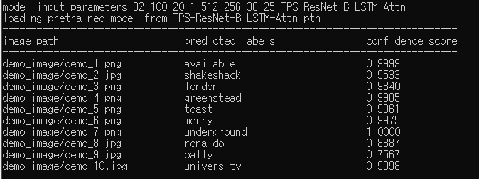 CUDA_VISIBLE_DEVICES=0 python3 demo.py --Transformation TPS --FeatureExtraction ResNet --SequenceModeling BiLSTM --Prediction Attn --image_folder demo_image/ --saved_model TPS-ResNet-BiLSTM-Attn.pth