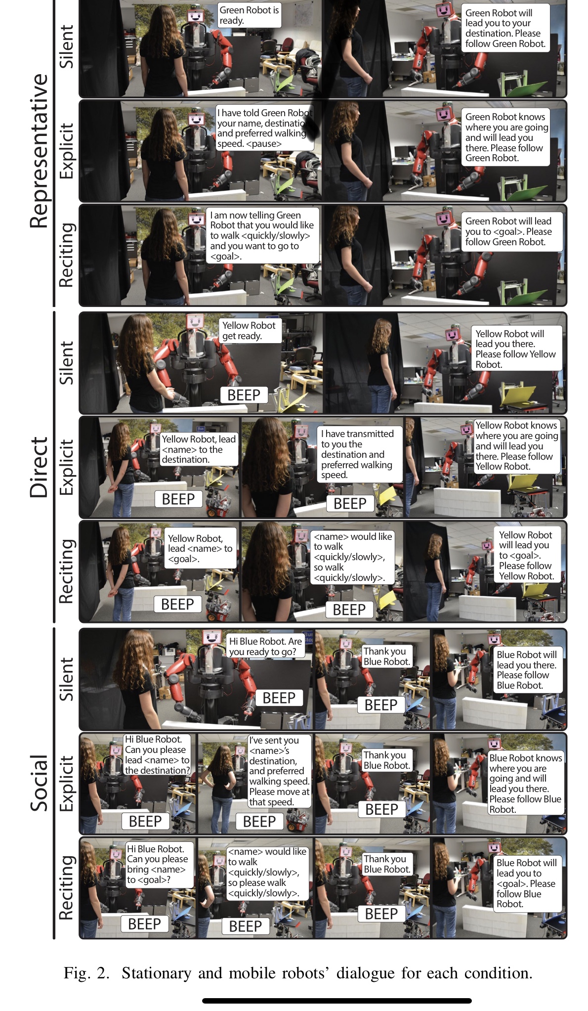 시나리오 : 사람이 고정 된 로봇에게 도움(assistance)를 요청하면, 로봇은 모바일 로봇을 소환하여 사람을 위치까지 데려다 주도록 한다. (이 연구 혹은 시나리오는 Institutional Review Board에서 허가 받은 연구이다.)