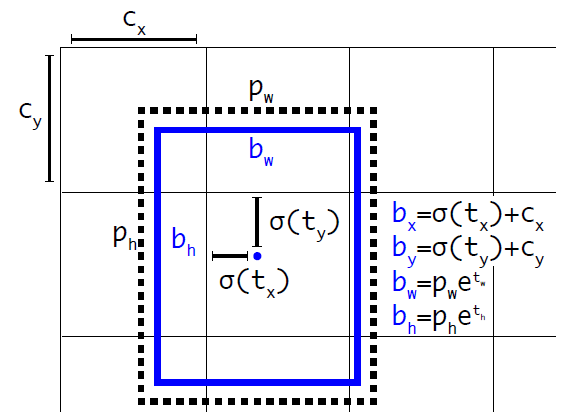 - b_x, b_y : 시그모이드 함수(sigmoid function)를 통해 t_x, t_y를 0~1 사이의 값으로 초기화