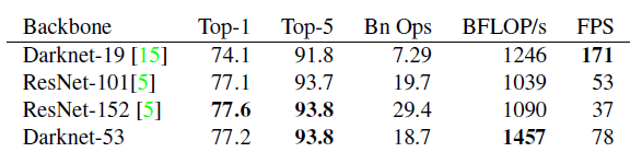 - YOLOv2에서 사용했던 Darknet19, 그리고 ResNet-101과 ResNet-152보다 정확도가 높고, FPS도 합리적임 (아래에 ImageNet에 대한 결과표 첨부)