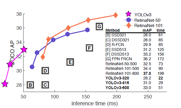 - 320*320 input을 가지는 YOLOv3는 28.2mAP의 성능을 내며, 판단 속도는 22ms로 매우 빠름