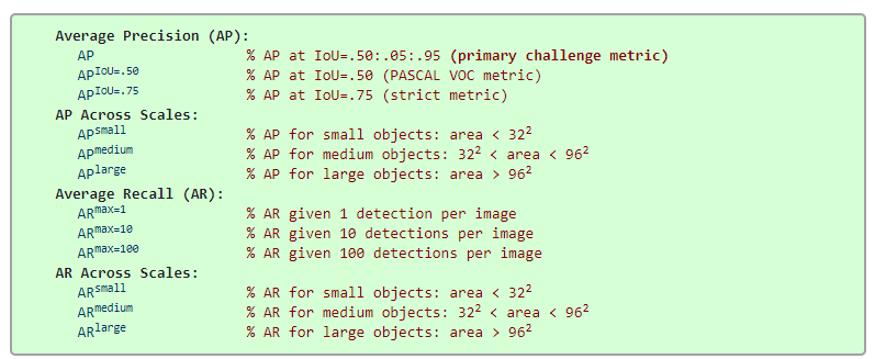 mAP의 평균을 다음의 IoU Threshold 값으로 구한 것입니다. (0.5, 0.55, 0.6, 0.65, ,,, , 0.9, 0.95) 즉 0.5~0.95 사이의 IOU threshold 값을 0.05 씩 값을 변경해서 측정한 mAP의 평균값입니다. IoU의 threshold 값이 mAP_0.5보다 높기 때문에, 수치는 mAP_0.5보다 낮게 나옵니다.