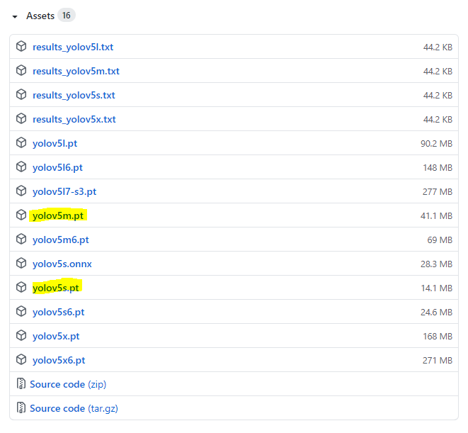 - 저는 yolov5s.pt를 다운받았습니다.
