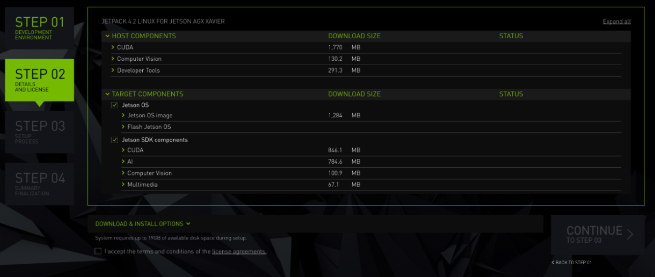 - STEP 02에서는 설치할 CUDA 등의 라이브러리 등을 체크하는 단계입니다. 모두 클릭하여 설치를 받으면 되고, 좌측 하단의 accept 항목을 체크하고, 다음 단계로 넘어갑니다.