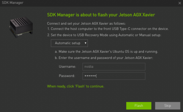 - PC와 Xavier를 연결하는 방법은 Automatic Setup 혹은 수동 setup을 하시면 됩니다.