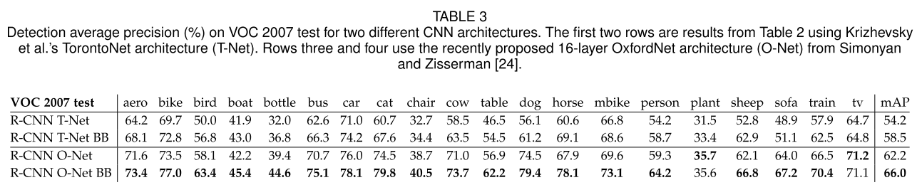 - Table 3을 보면 OxfordNet이 TorontoNet보다 mAP를 7.5% 향상시킨 것을 확인할 수 있다.(58.5% -> 66.0%)