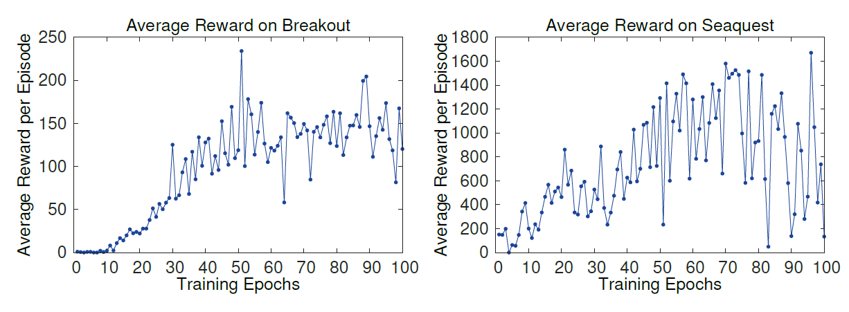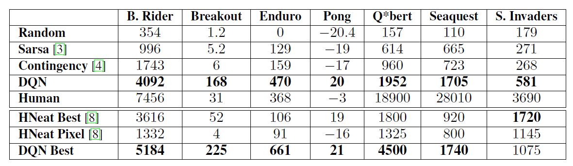 - 7개의 유명한 ATARI game에 대해서 DQN의 성능을 테스트함 (Beam Rider, Breakout, Enduro, Pong, Q*bert, Sequest, Space Invaders.)