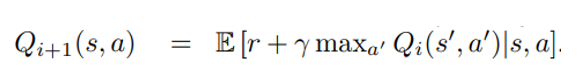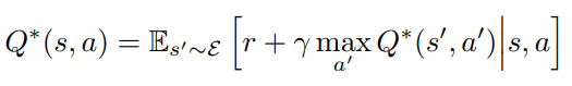 - bellman 방정식 : 다음 time-step에서 sequnce s'의 최적 값 Q*(s', a')가 모든 action a'에 대해 아는 경우, 최적의 전략은 기댓값(expected value)인 r + γQ*(s', a')를 최대화하는 action a'를 선택