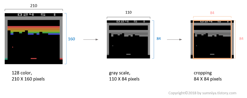 - 110 * 84 pixel로 이미지 사이즈를 줄이고, gray-scale로 변경 (채널 수 3 -> 1)