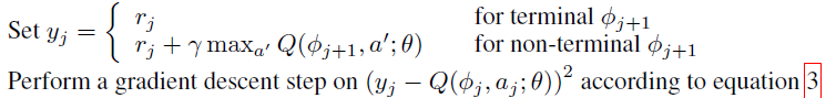 - 정답 값 y_j은 아래와 같이 정의하고, 이 정답값과 DQN의 판단값의 차이를 이용하여 SGD로 DQN을 최적화 시킴