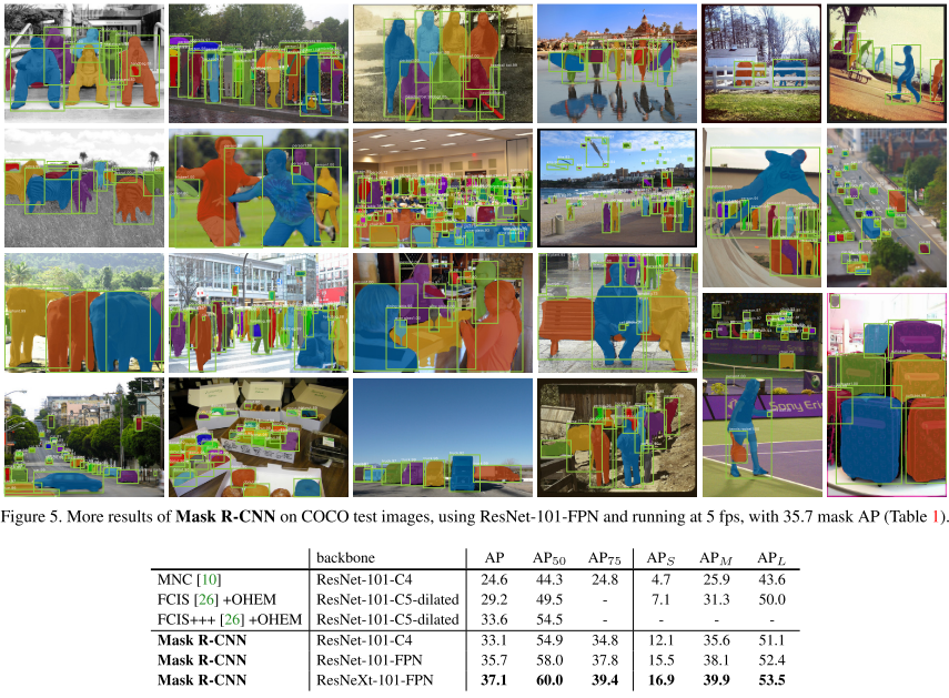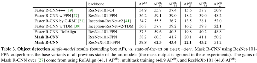 - ResNet-101-FPN을 사용한 Mask R-CNN이 기존의 SOTA모델들보다 성능이 좋았다.